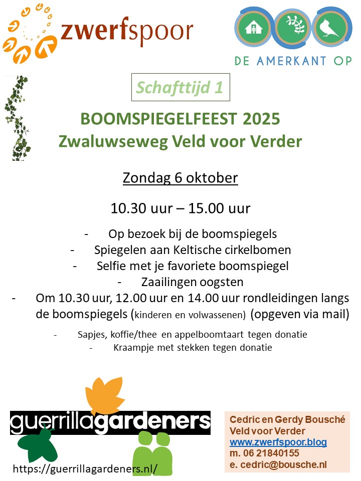 De boomspiegels verraden dat de bomen een beetje rust zoeken maar ook onder de grond alles al weer klaar zetten voor het komende voorjaar. Alle diertjes, insecten, schimmels doen daar een mee. Kom dus maar eens kijken op de Boomspiegelfeestdag waar Guerilla Gardeners een oproep voor doet!