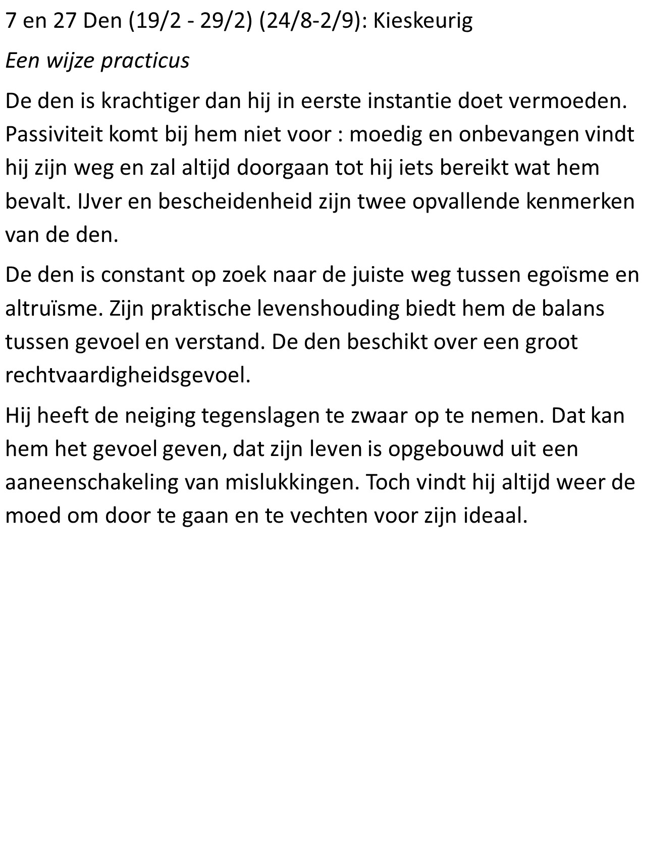 - Den (19/2 – 29/2): Kieskeurig