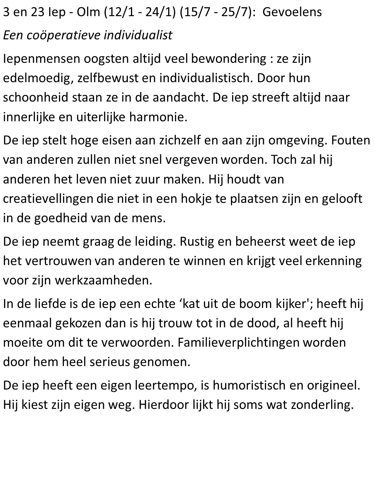 - Iep – Olm (12/1 – 24/1): Gevoelens