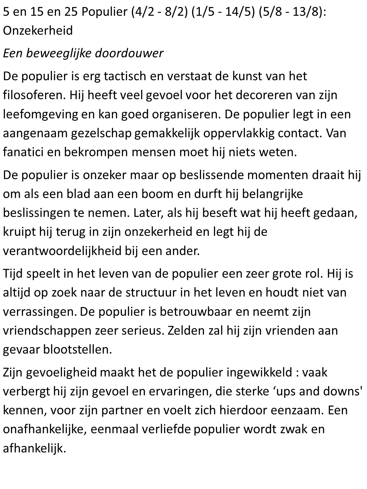 - Populier (5/8 – 13/8): Onzekerheid