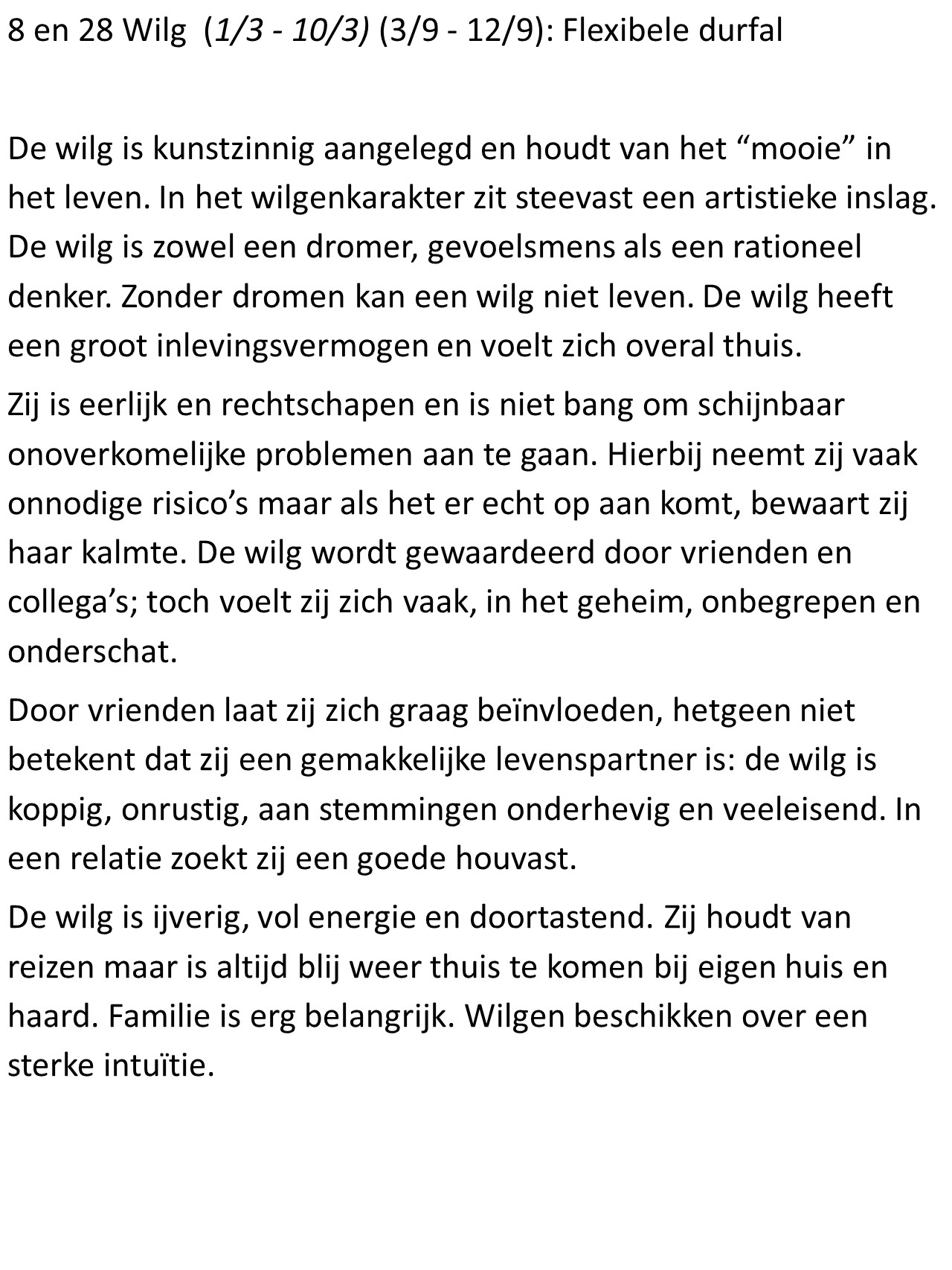 - Wilg (3/9 – 12/9): Flexibele durfal